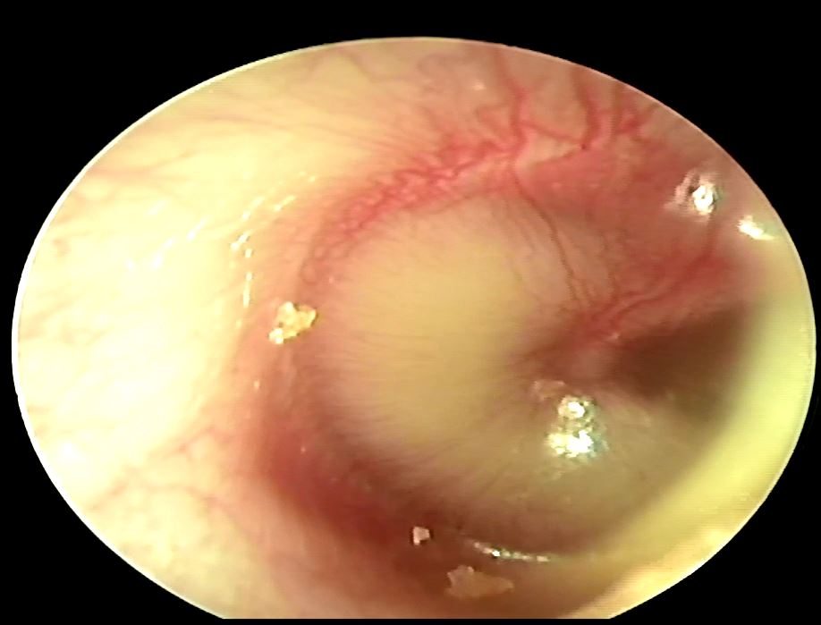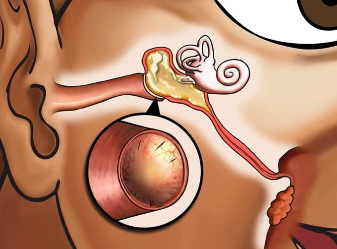 中耳腔藉由耳咽管平衡裡面的壓力,如果耳咽管本身阻塞或是呼吸道的纖毛運動變差,原本裡面的黏液就排不出來,久了就會形成積水狀,積水一多就有可能會造成耳鳴、耳悶、聽力減退等等現象;中耳腔積水又稱為glue ear,意思就是裡面可能會有清澈的或是黏稠的液體,孩子一般會有輕度聽力減退 (大約會掉27分貝) 或是語言發展遲滯等現象,跟急性中耳炎不一樣的地方是一般不會有耳痛、發燒或是倦怠等症狀。成因