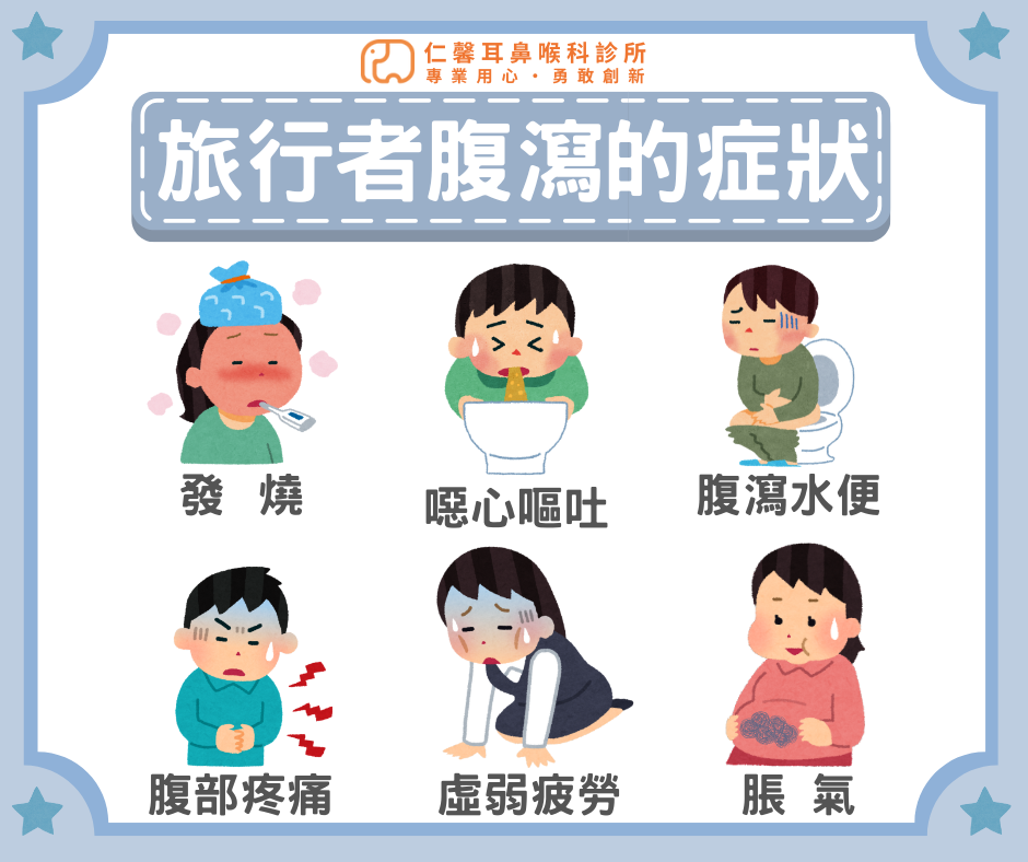 旅行者腹瀉的症狀通常突然出現,通常在接觸受污染的食物或水幾天後發生。症狀可能包括: