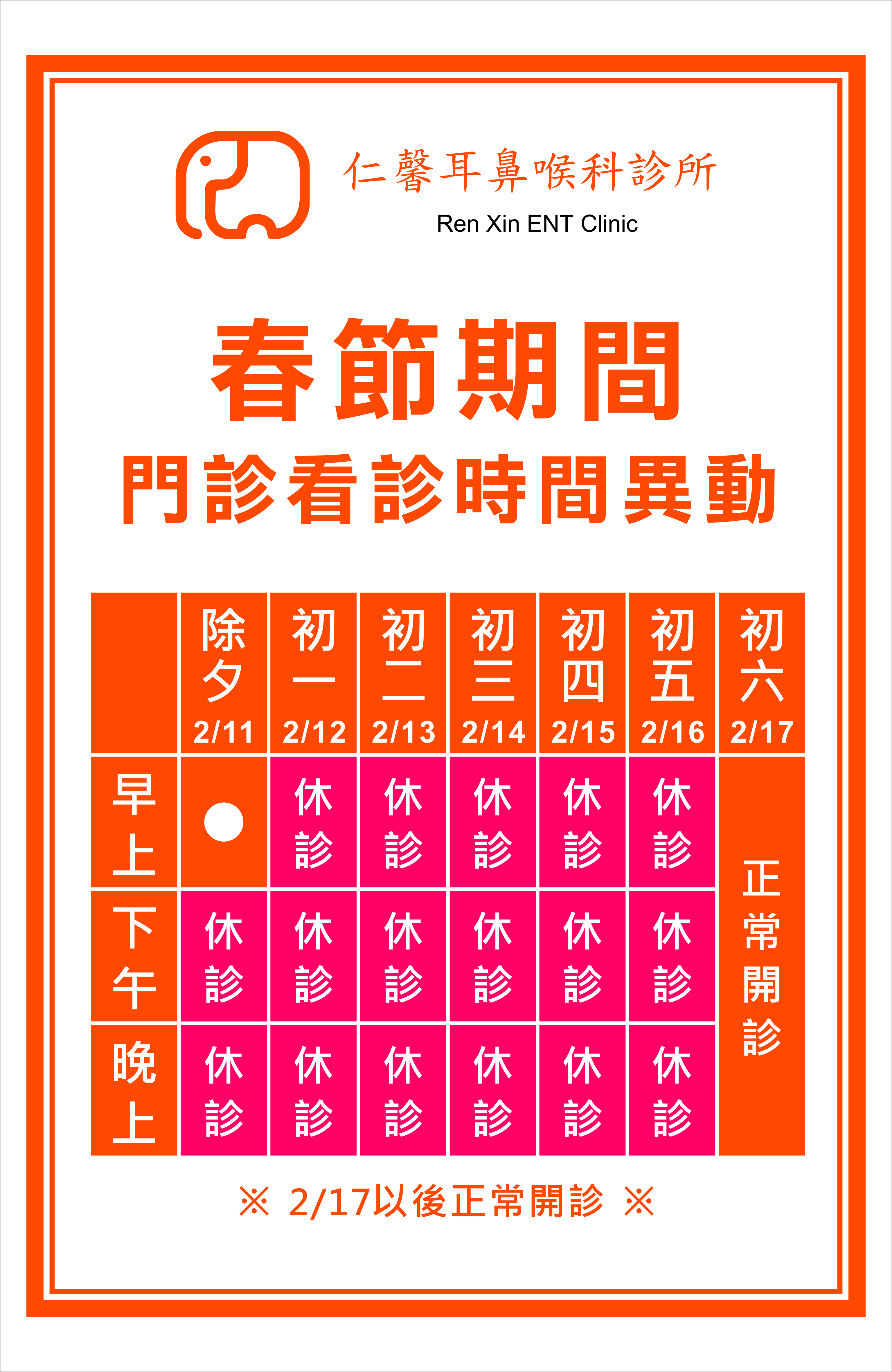 110年春節門診公告 首頁 最新消息 110年春節門診公告 休診公告 春節期間除夕(2/11)早上有看診,接下來就休診到初五,初六 (2/17)以後正常開診,造成不便敬請見諒~ 先預祝大家牛轉乾坤財運犇騰 過年期間還是要注意防疫,勤洗手出入公共場所配戴口罩,祝福大家都平安順心