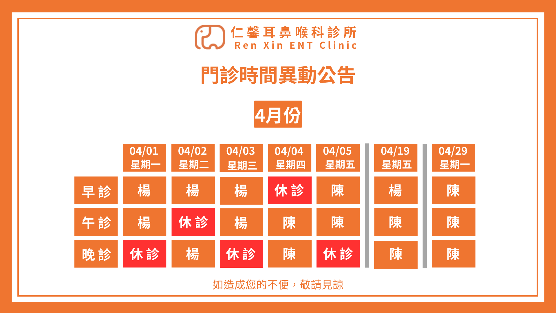 仁馨耳鼻喉科診所4月份門診時間異動公告