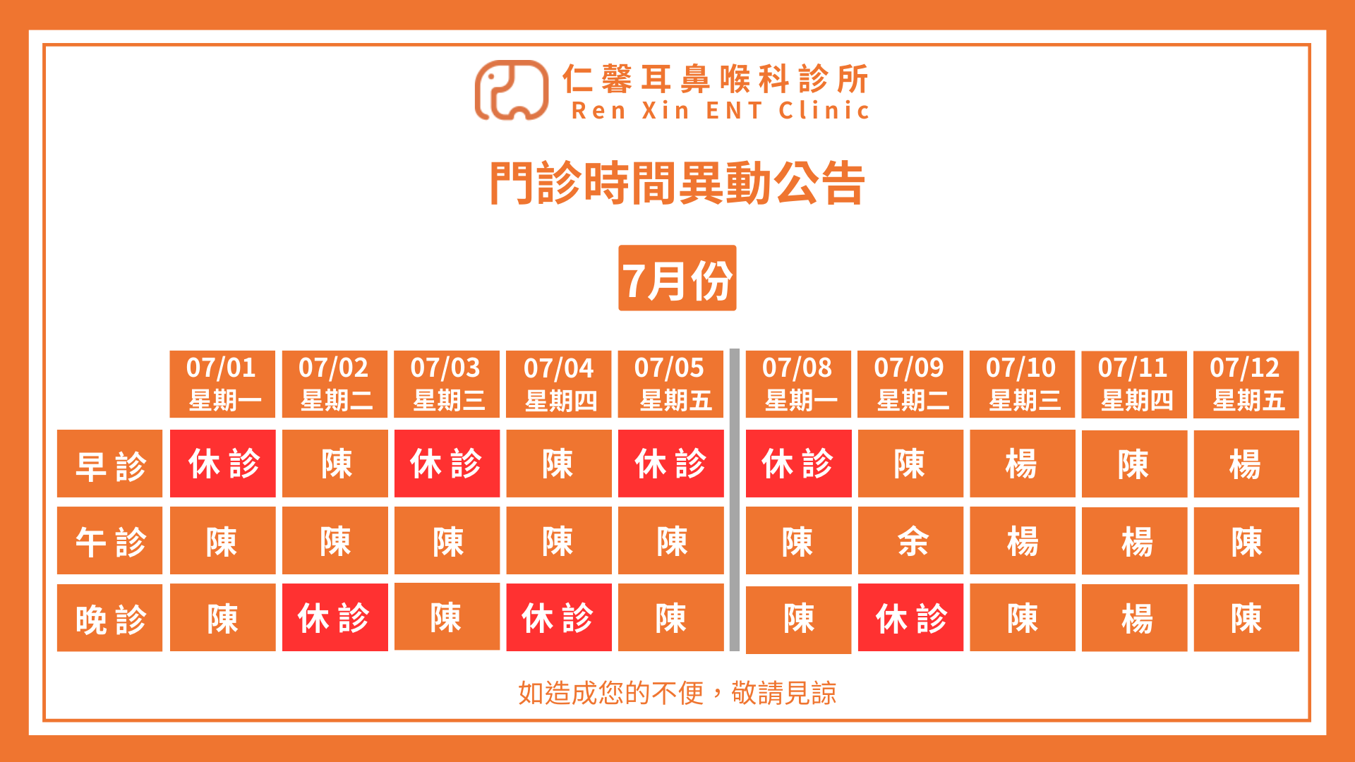 仁馨耳鼻喉科診所7月份門診時間異動公告