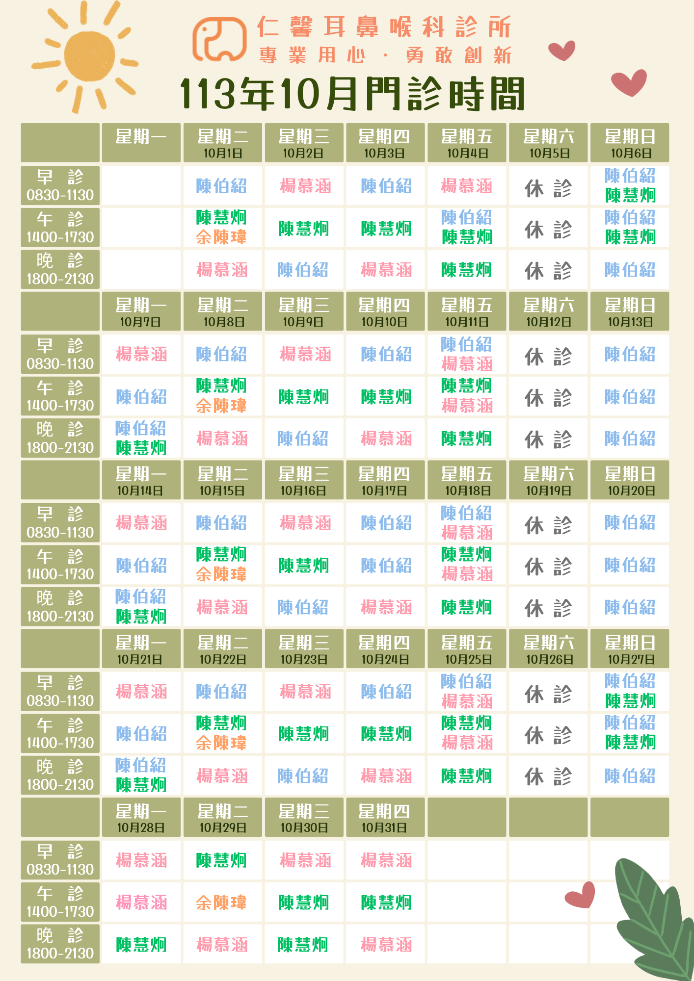 仁馨耳鼻喉科診所為提供更完善的醫療服務,我們很榮幸邀請到陳慧炯醫師加入團隊,陳慧炯醫師曾任職於慧安耳鼻喉科診所院長、林口長庚及慧安耳鼻喉科主治醫師、林口長庚兒童醫院耳鼻喉科主治醫師等職,擁有豐富的專業與臨床經驗,陳慧炯醫師的加入將更完善我們的醫療團隊,10月1日開始正式看診,以下是10月的門診時間表以及陳慧炯醫師的介紹,希望藉由強強聯手的醫療團隊讓仁馨耳鼻喉科診所為病患提供更全面更優質的醫療服務!!