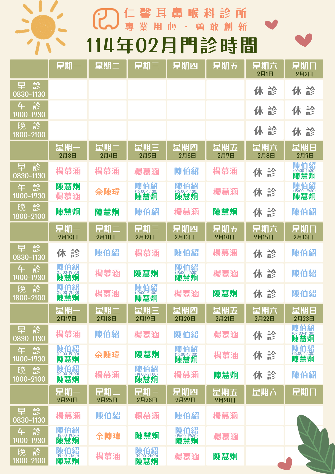 仁馨耳鼻喉科診所114/02月門診時間表,請參閱附圖!