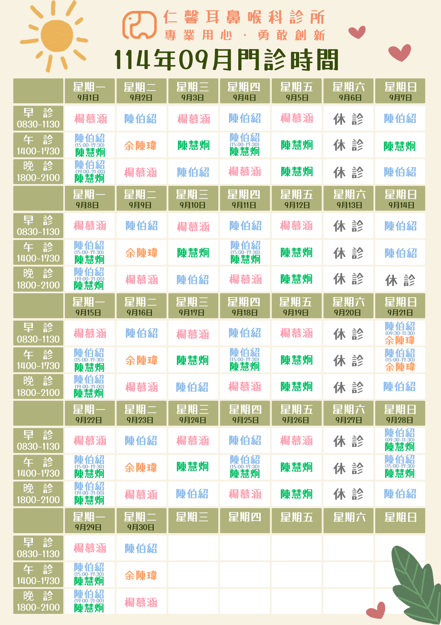 仁馨耳鼻喉科診所114/09月門診時間表,請參閱附圖!