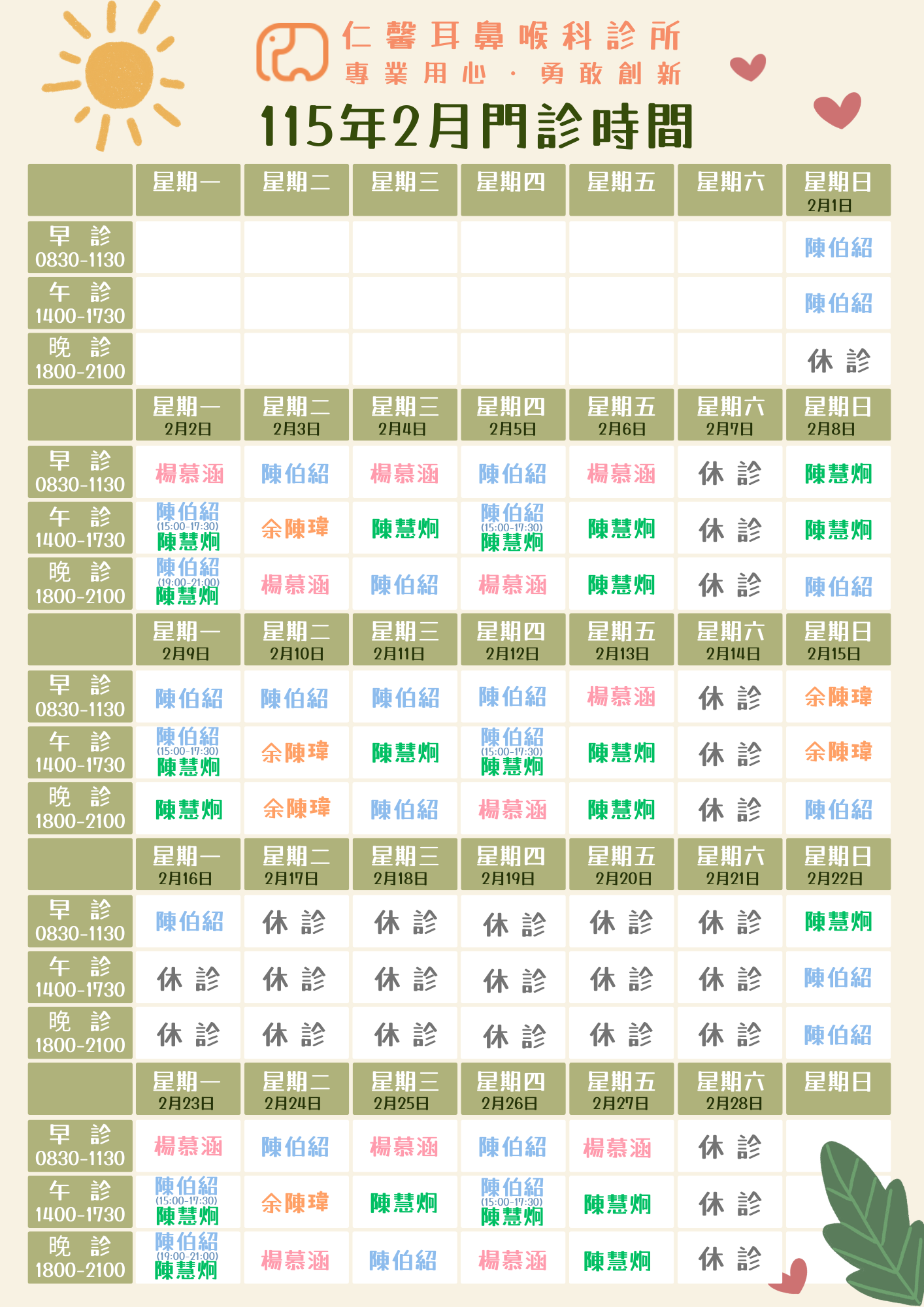 仁馨耳鼻喉科診所115/02月門診時間表,請參閱附圖!