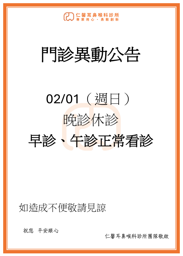 門診時間異動公告 02/01(日) 晚診休診