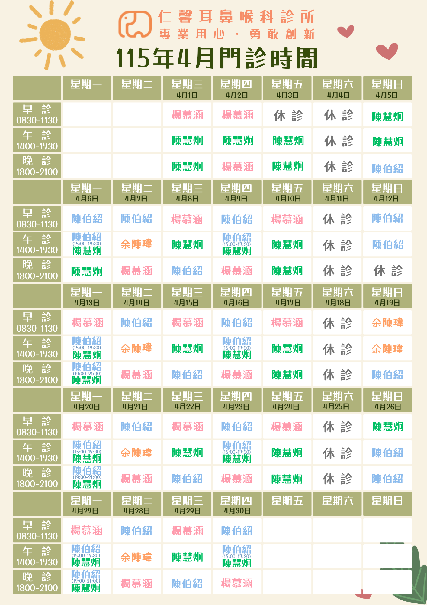 仁馨耳鼻喉科診所115/04月門診時間表,請參閱附圖!