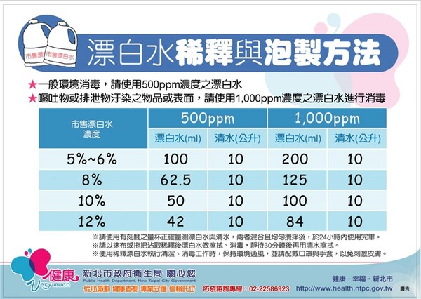 PS. 可以用一些方式減少腸病毒的活性,強鹼、紫外線、高溫以及漂白水等等,我們可以發現前面三種其實很麻煩而且不容易做到,比較容易做到的是第四種漂白水,漂白水裡面含有次氯酸可以減少腸病毒的活性,要如何去配製可以參考下面這個表!!