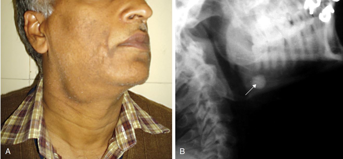 唾液腺結石可能會發生在下頷腺或是腮腺,一般來說下頷腺的發生機率比較高可能是因為他的位置比較低的關係,唾液腺結石是造成單側下頷腺或是腮腺反覆性腫脹的主要原因,有時候也會合併細菌感染,結石的組成可以分成有機跟無機兩個部分,有機包含醣蛋白、黏多醣以及脫落的細胞殘骸,無機包含碳酸鈣跟磷酸鈣,通常結石的中心主要是有機成分而周邊則為無機成分,有時候也會在結石內發現細菌隱身其中,形成結石的假說有兩種,第一種可能是唾液腺細胞內的微結石 (microcalculi) 分泌道管腔中,變成了結石的核心之後越長越大;第二種假說是口腔中的食物以及細菌跑到唾液腺的管路中形成結石的核心,根據研究唾液腺結石大約一年會長大1mm左右,平均大小為3.2mm (腮腺) 以及4.9mm (下頷腺),Sheman等人的研究也顯示唾液腺結石的形成跟水質的硬度無明顯關聯性,倒是有人發現抽菸會造成結石形成的機會增加。