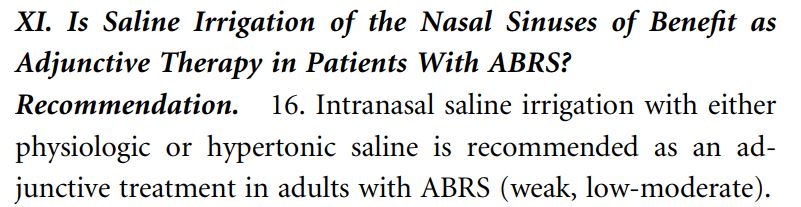 急慢性鼻竇炎根據美國的統計是排名前五會需要使用抗生素的疾病,得到急慢性鼻竇炎的病人一般來說都會造成工作或學習效率的低落,而且會花上很多時間去就醫,以小孩而言,一個小孩平均來說一年大約會有6-8次左右的上呼吸道感染(大多為病毒感染),只有大約13%會得到細菌性鼻竇炎,真正的急或慢性鼻竇炎如果沒有好好治療的話,可能就會引起一些長期的併發症,例如 : 鼻塞、持續流鼻膿、白天以及夜間的咳嗽、頭痛、白天疲、甚至可能誘發氣喘等等,但是如果每次都認為是細菌性鼻竇炎一直讓病人吃抗生素的話,有可能會培養出抗藥性的菌種,也可能會造成身體的負擔跟傷害,所以在治療方面如何讓病人加速緩解並且可以不要吃那麼多藥是我們最關心的,之前有提到鼻竇炎的致病因就是黏液排出不順,在一些上呼吸道感染或是過敏性鼻炎的病人身上可以發現鼻黏膜纖毛運動變差的現象,如此一來會提高得到鼻竇炎的機率,IDSA 鼻竇炎治療指引認為可以使用生理食鹽水或是高張食鹽水鼻腔沖洗來做為治療鼻竇炎的輔助治療,這裡建議把它當成輔助治療也就是把它想成是配菜,並沒有建議把他當成主菜喔!!也就是說如果是細菌性鼻竇炎如果沒吃藥只是單純洗鼻子可能效果會不佳,至於洗鼻子為何對於鼻竇炎會有幫助,據推測應該是有以下這些功能 : 減少鼻腔分泌物的黏稠度、減少鼻腔黏膜的腫脹、移除過敏原、移除發炎物質、移除細菌、移除壞死的細胞跟組織液等等,這些動作可以讓鼻腔以及鼻竇更清爽,鼻竇的通氣也會更好,病人自身也會覺得鼻塞獲得一定程度的緩解,有一些人認為這有點類似"清創"的感覺,一方面我們自身的抵抗力加上抗生素對抗感染,另一方面移除一些不利於我們鼻竇的物質,對於急或慢性鼻竇炎是有一定程度的幫助,只式洗鼻子需要練習以及一點小小的勇氣,習慣了就跟騎腳踏車一樣是非常簡單且舒服的一件事情喔!!